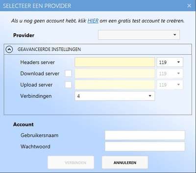 ➩ When all fields are filled, click 'Verbinden'. Spotnet starts immediately with downloading spots (download information), user replies, spamfilters etc.. Please consider that the initial installation from Spotnet will take some minutes, to build up the database. You can see the download progress in the right bottom.
